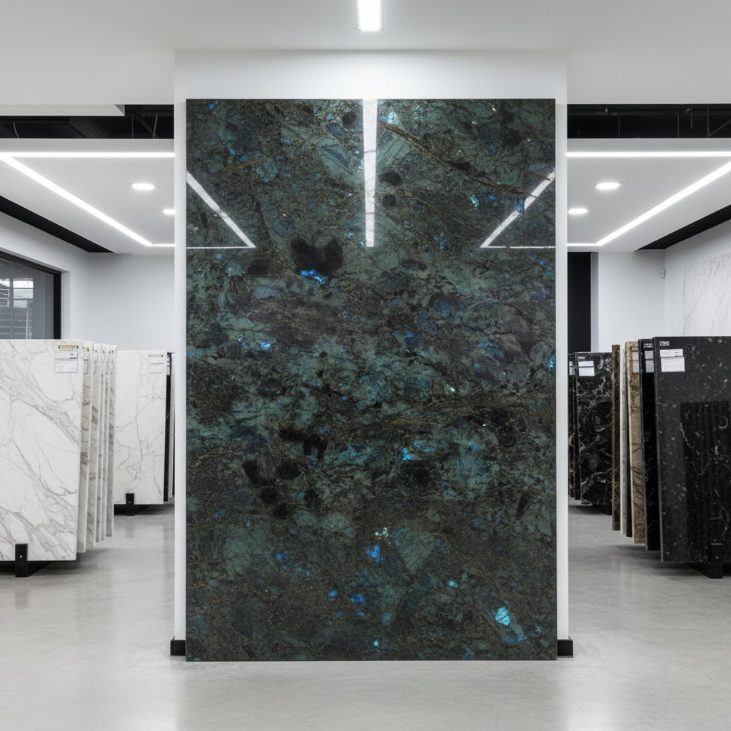 What sets Labradorite stone apart is its mesmerizing labradorescence effect—a natural optical phenomenon that produces flashes of electric blue, steel grey, and silver hues across a dark background. Each slab is unique, making every installation a one-of-a-kind masterpiece.