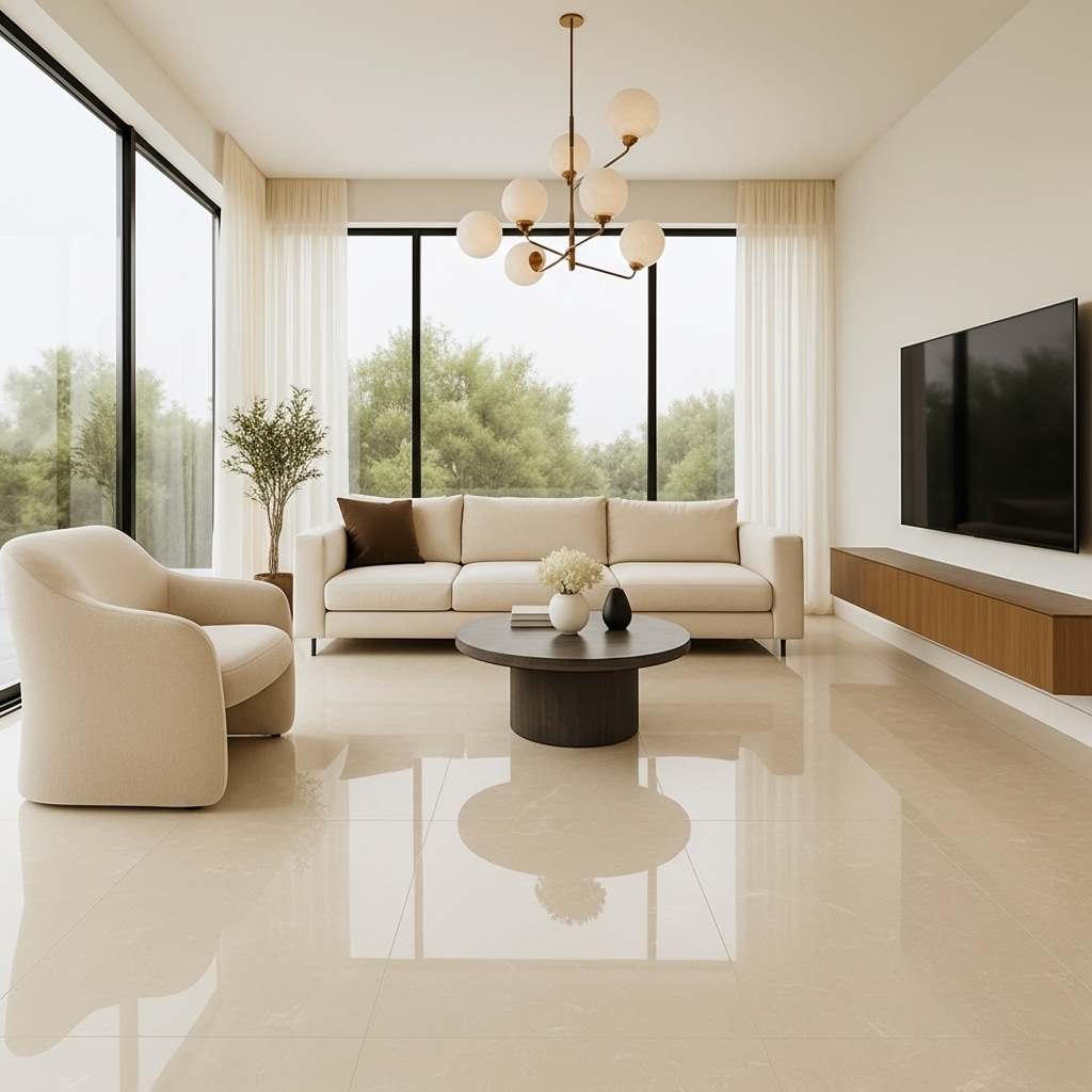 Polished Aqua Cream surfaces brighten interiors and make rooms appear more spacious and welcoming.